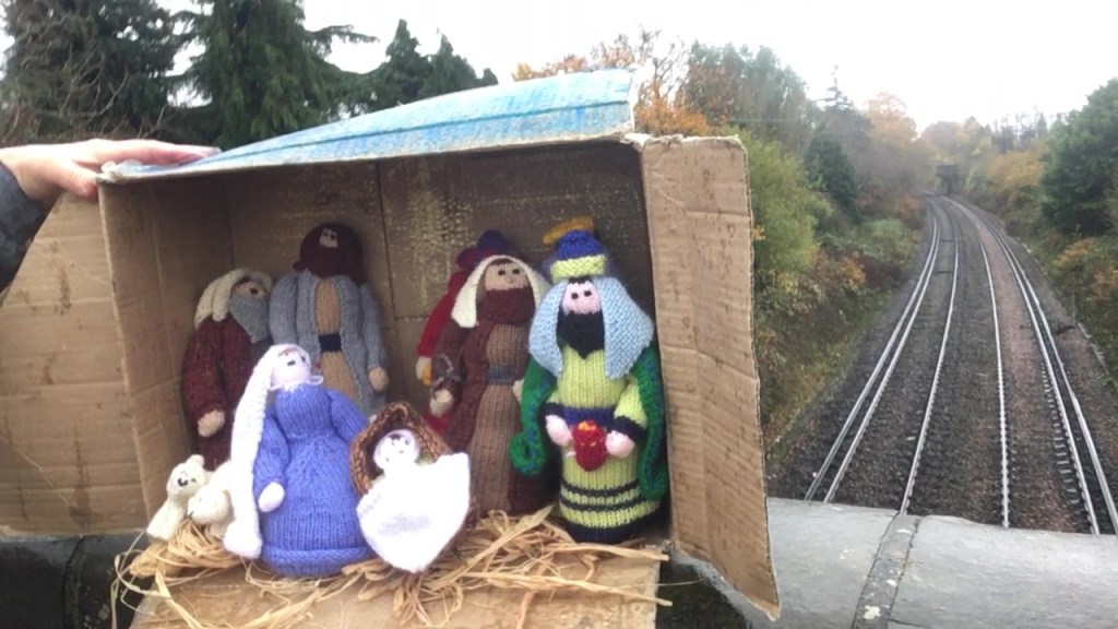 Summoned by bells – the Knitivity characters stop for a rest somewhere in Hale.