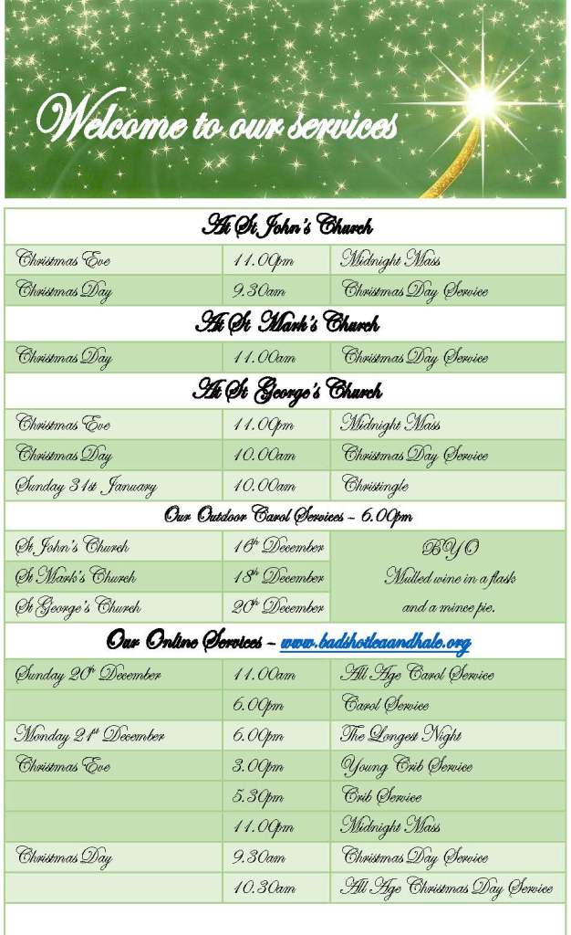 As we move towards Christmas we celebrate with carols sung both in church and outside, and on Christmas Eve we hold crib services at all three churches (two crib services at St George’s!) and then Midnight Mass beginning at 11.30pm in St George’s and St John’s.