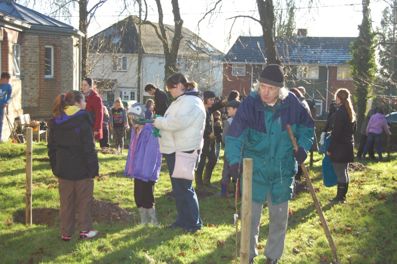 Each tree needs a stake and protection from the rabbits