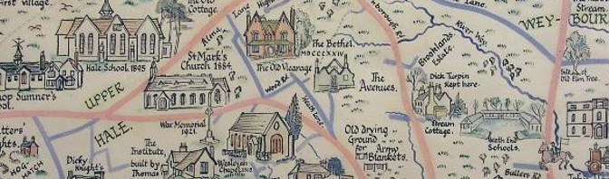 Evelyn Caesar’s pictorial map of the part of Badshot tithing which became Hale Parish.